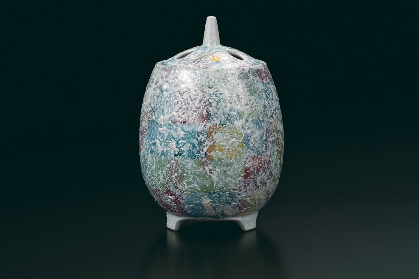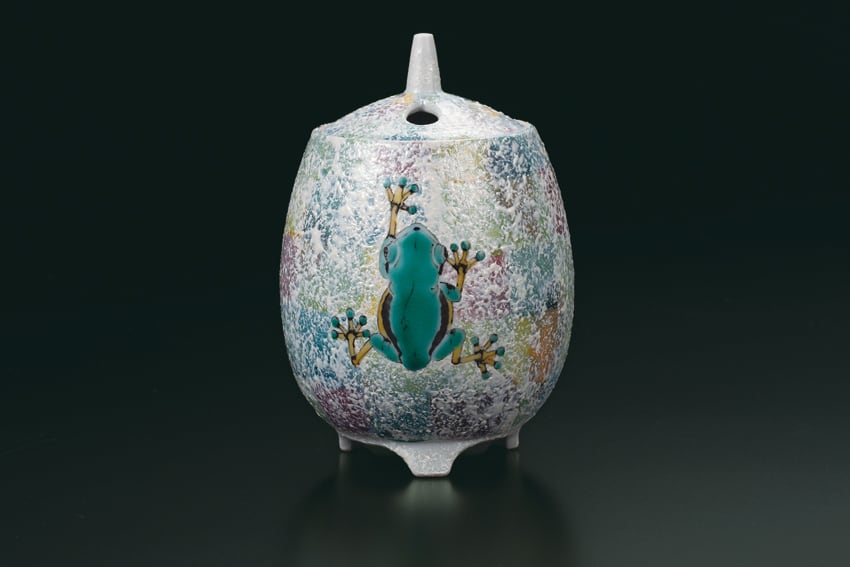 この香炉は、洋彩と九谷上絵で描かれた縁起の良い蛙の絵が特徴のです。穏やかな表情の蛙が描かれ、見る人を和ませるデザインとなっており、お部屋のインテリアとしても際立つ存在感を放ちます。