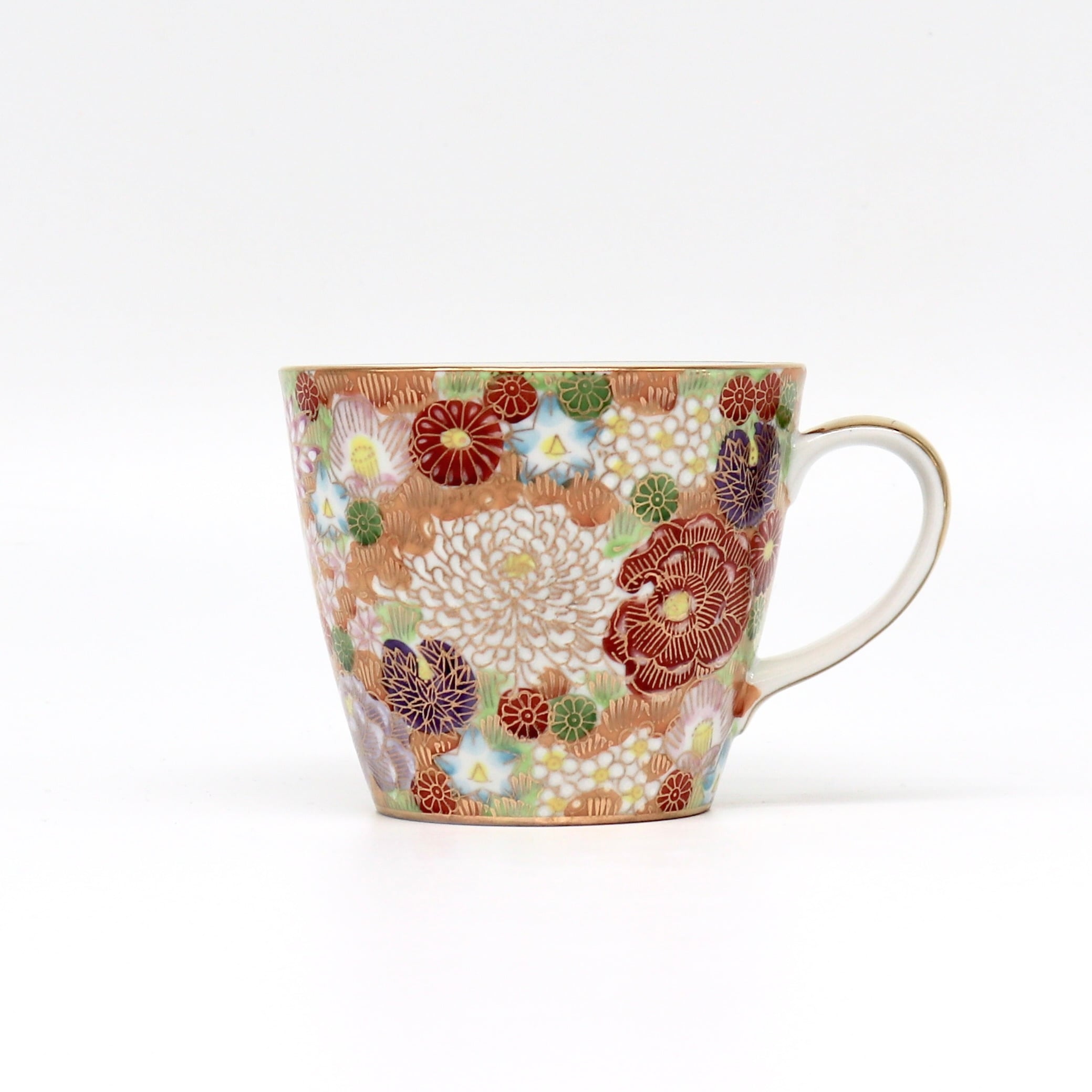 大志窯のマグカップは持ちやすく、日常使いにぴったりの一品です。こちらのマグカップは九谷焼の伝統技法「金花詰」で彩られており、口縁の金色が華やかで豊かな時を演出します。