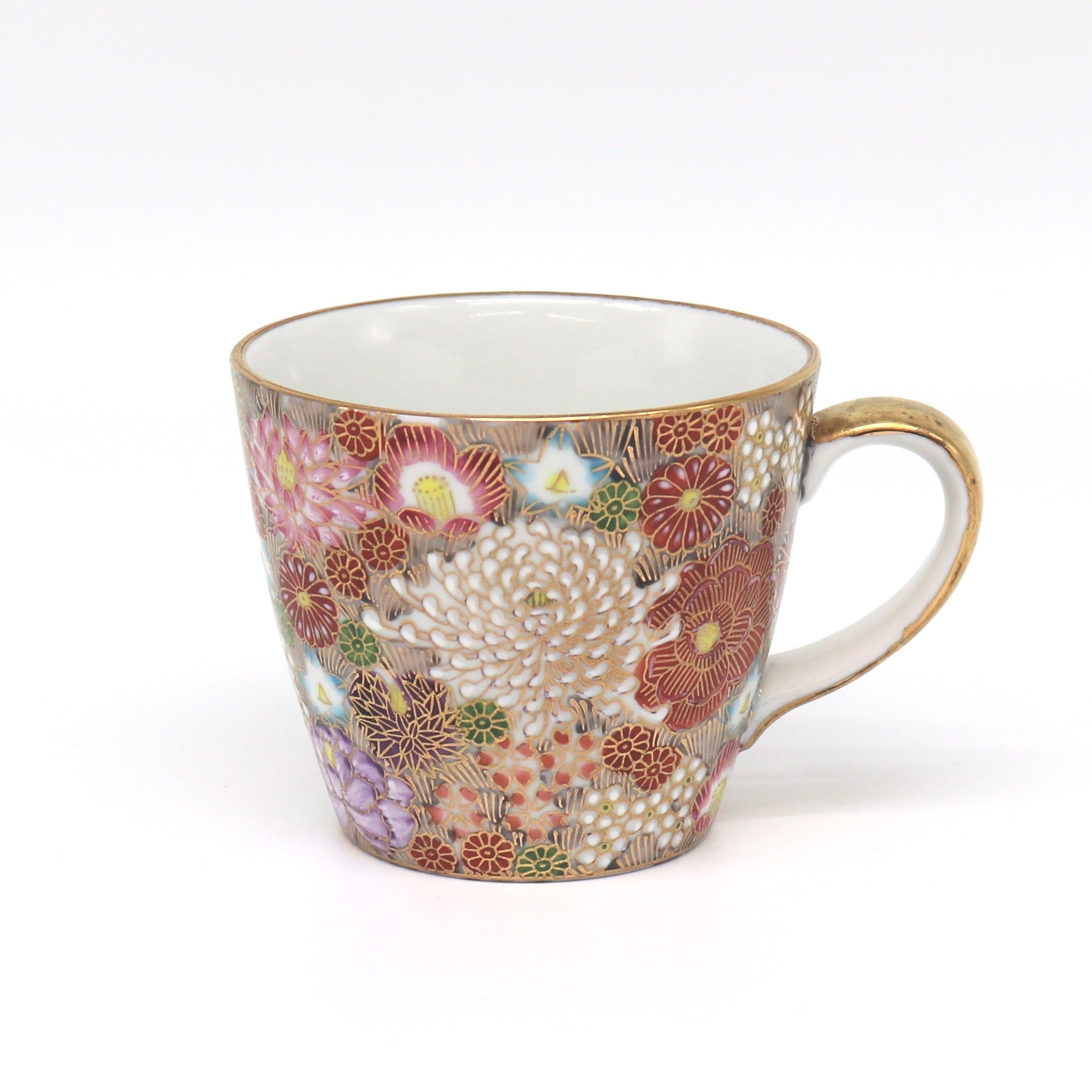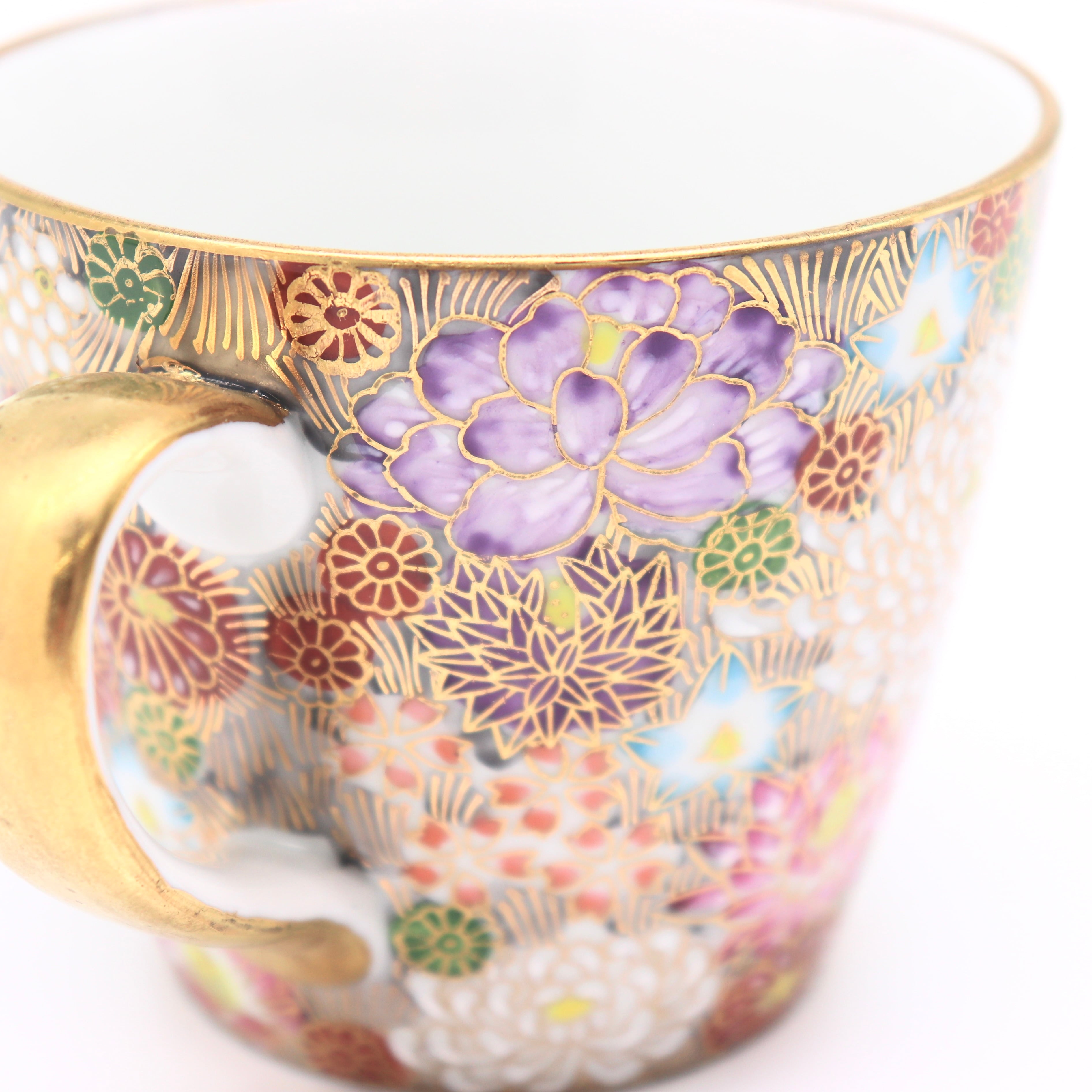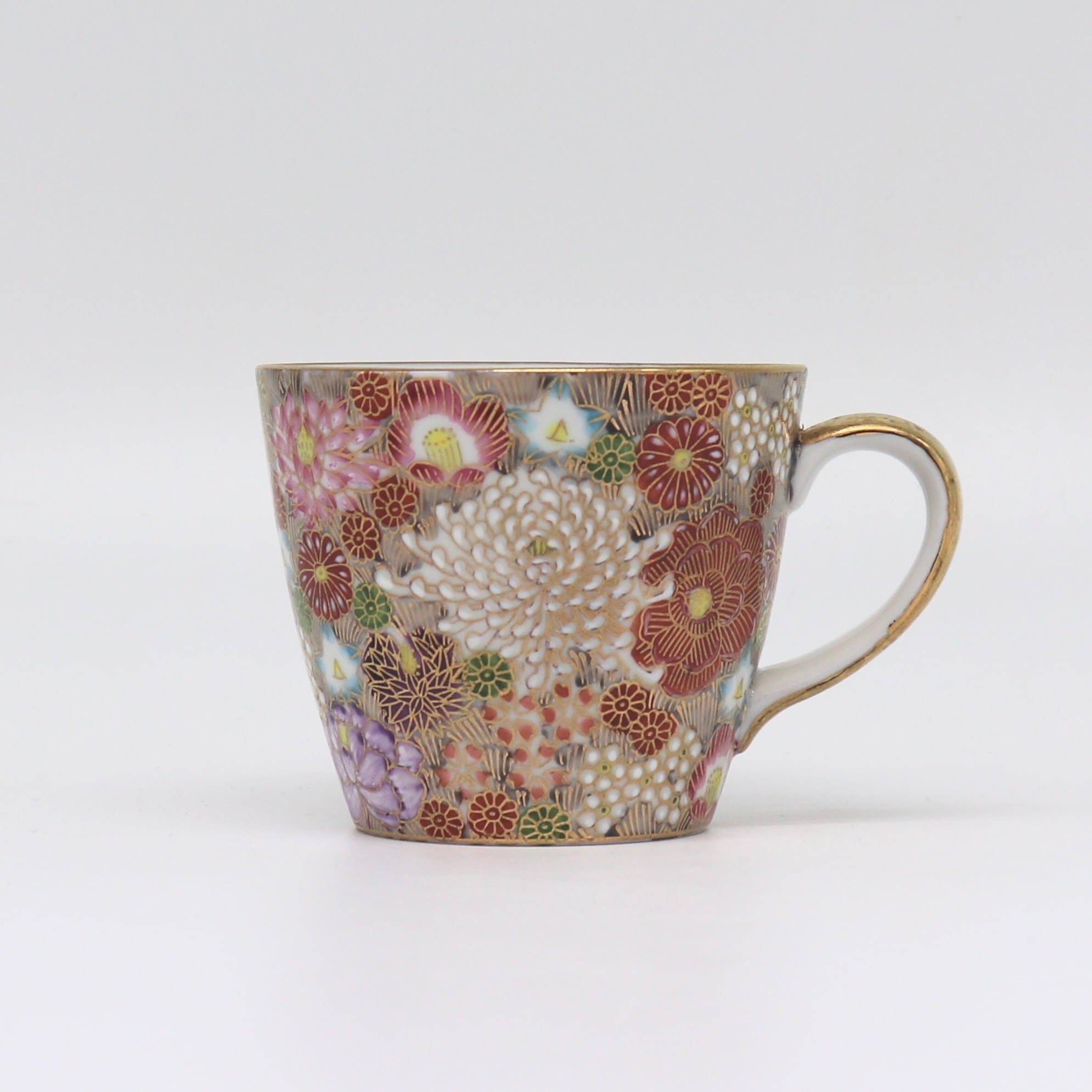 大志窯のマグカップは持ちやすく、日常使いにぴったりの一品です。こちらのマグカップは九谷焼の伝統技法「金花詰」で彩られており、口縁の金色が華やかで豊かな時を演出します。