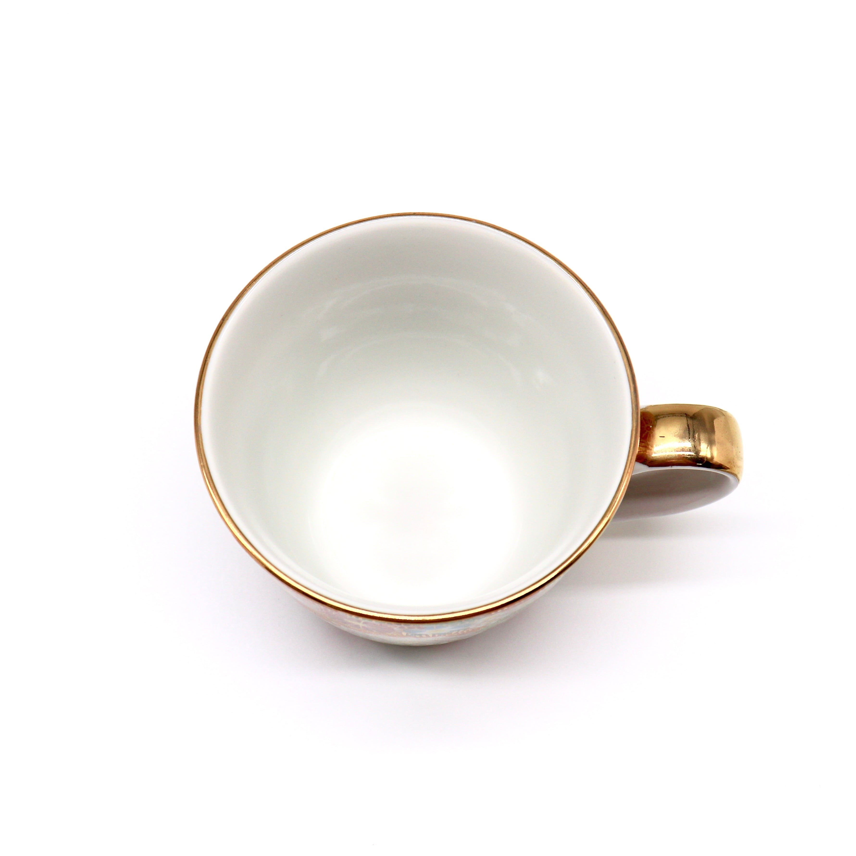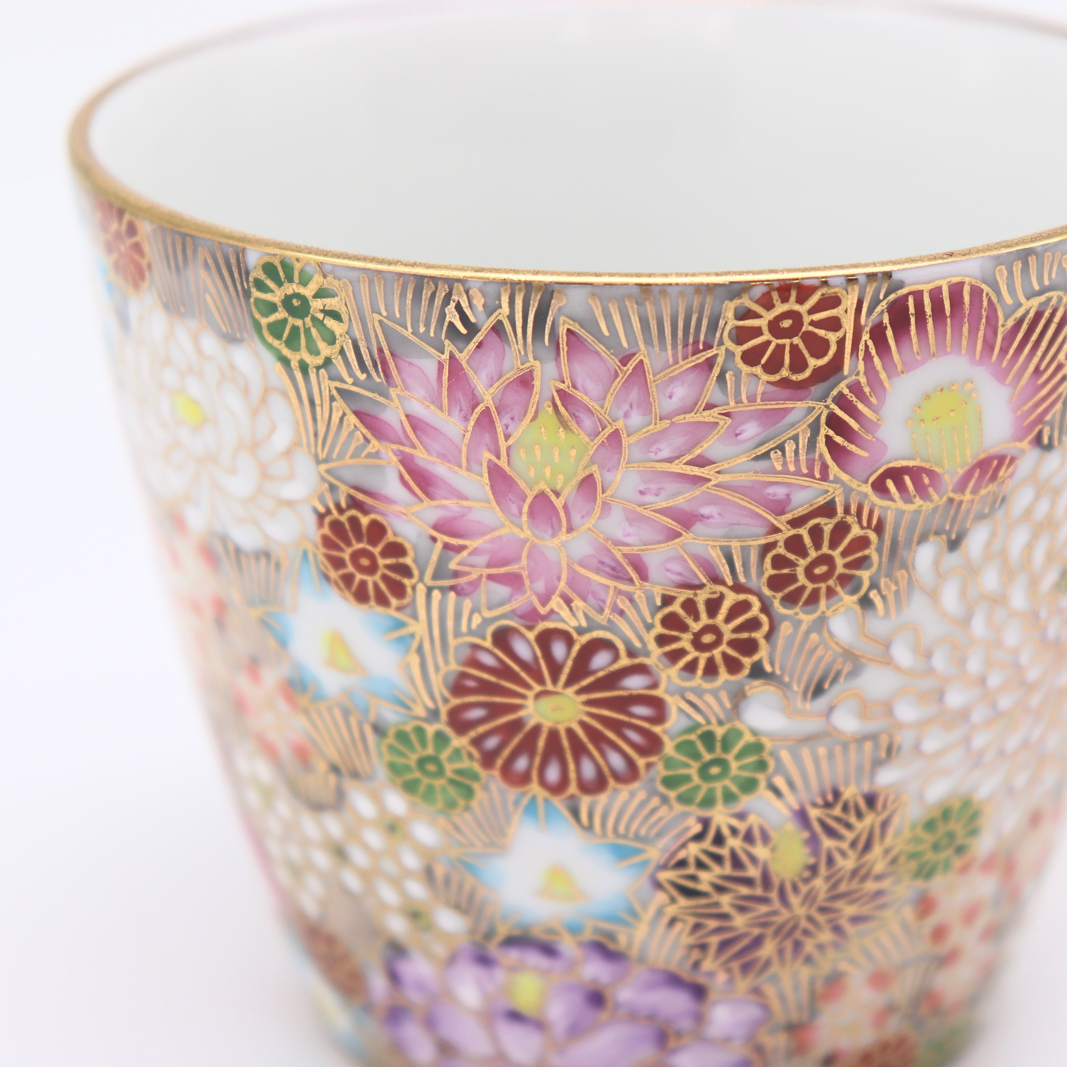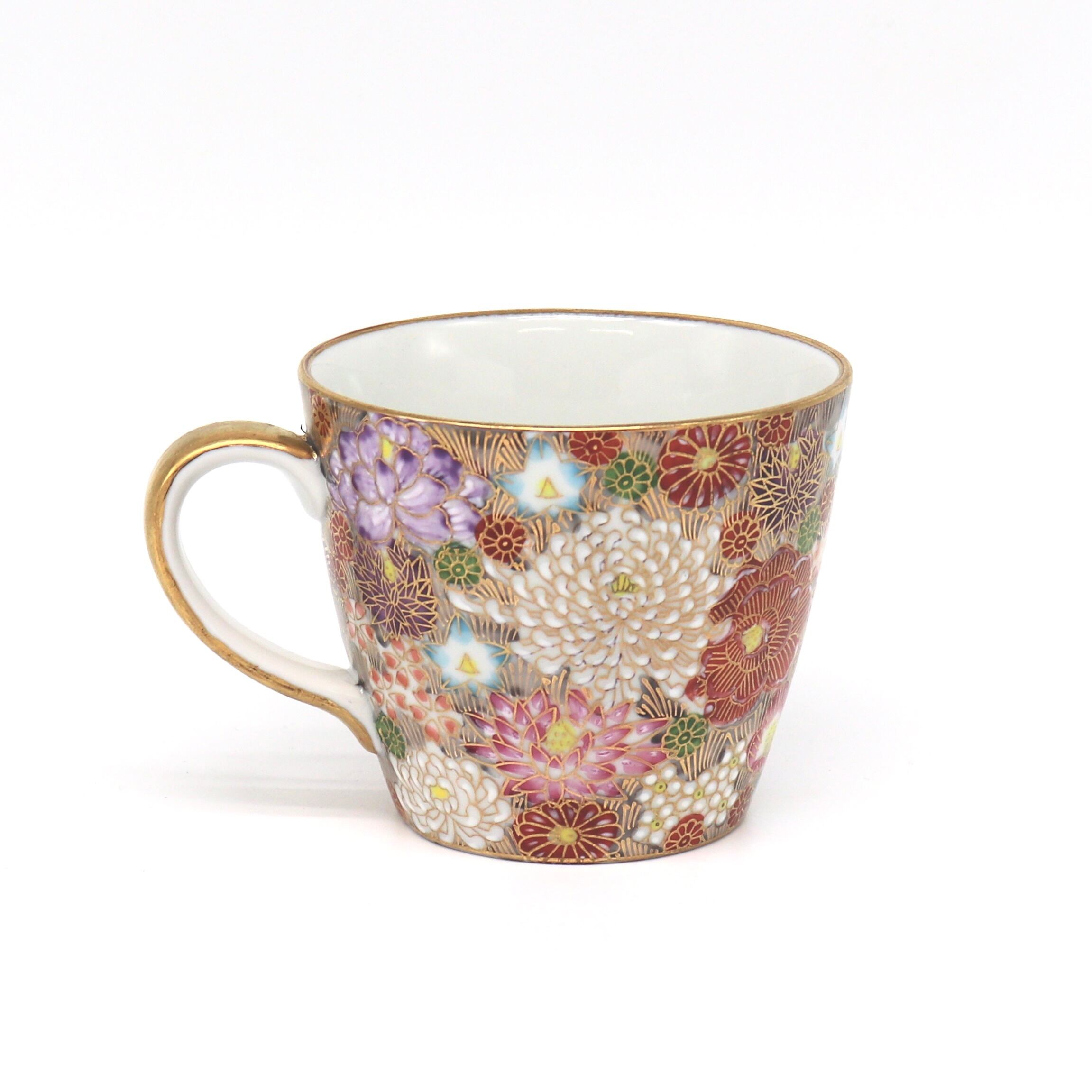 大志窯のマグカップは持ちやすく、日常使いにぴったりの一品です。こちらのマグカップは九谷焼の伝統技法「金花詰」で彩られており、口縁の金色が華やかで豊かな時を演出します。