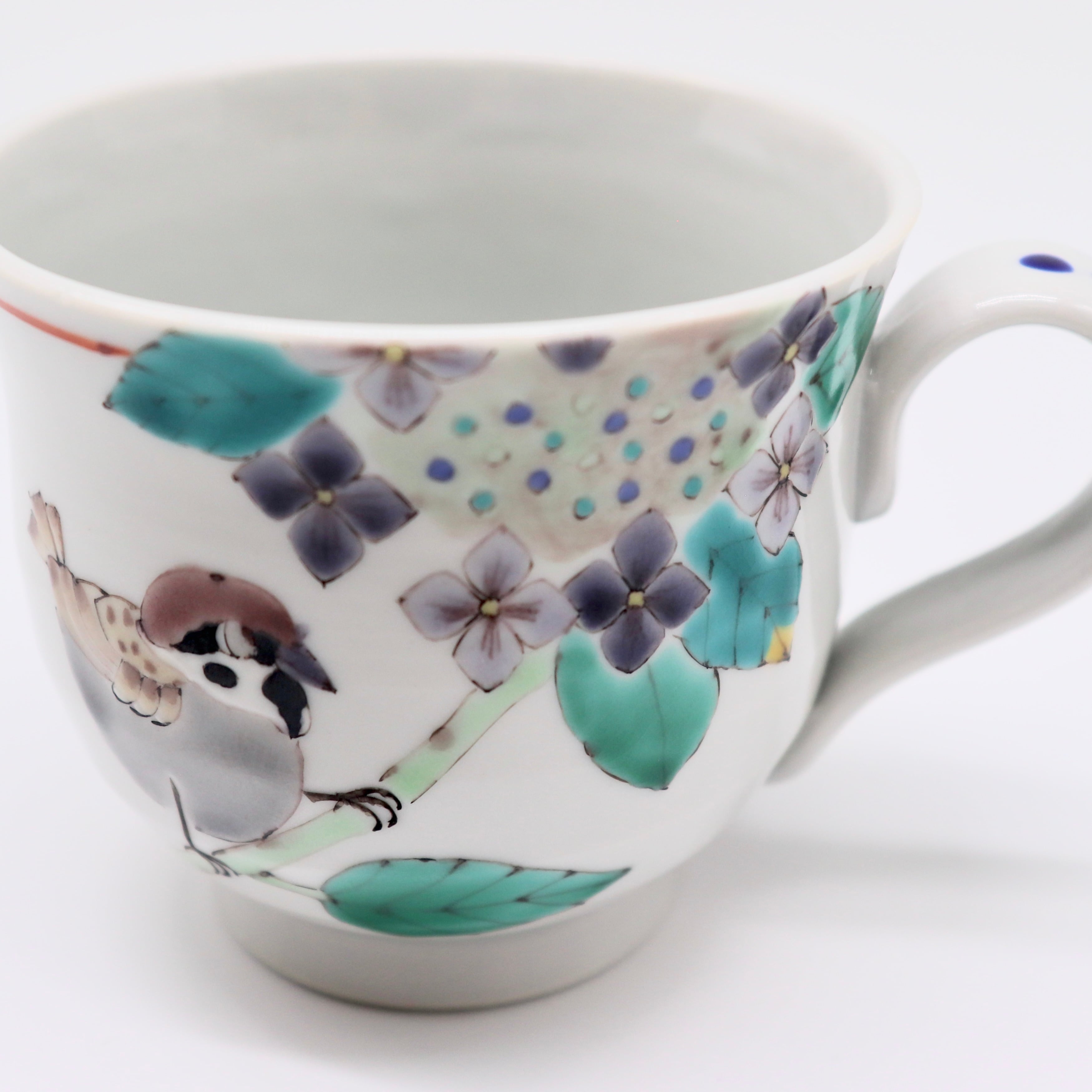 九谷焼 大志窯:色絵花鳥 マグカップ 〜額紫陽花に雀〜